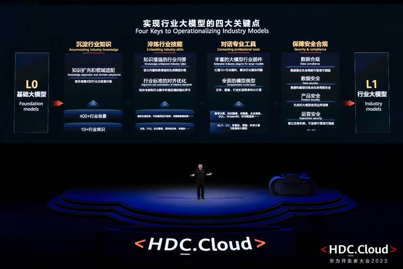L1层是N个行业大模型,华为云既可以提供使用行业公开数据训练的行业通用大模型,包括政务,金融,制造,矿山,气象等大模型;也可以基于行业客户的自有数据,在盘古大模型的L0和L1层上,为客户训练自己的专有大模型。