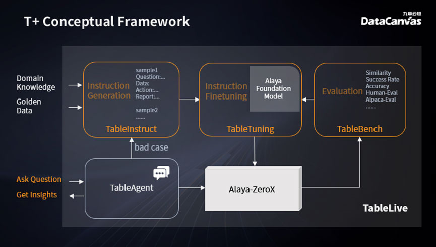 九章云极DataCanvas公司自主研发的Alaya九章元识大模型是TableAgent背后的关键技术支撑。在Alaya基础大模型之上微调的Alaya-ZeroX模型组,通过一系列擅长不同能力的模型组合完成复杂的分析任务。不同参数规模的模型同时满足了对生成质量和推理性能的要求。