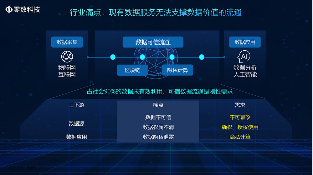 既然数据被作为新的生产资料,显然以数据为核心的全过程开发、全价值链发掘需要技术、产业的补位与协同。在围绕数据的生态链条中,定位为数据价值流通基础设施提供商的零数科技扮演着重要角色。