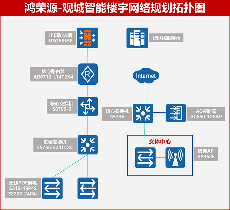 针对上述痛点,鸿荣源观城采用“住宅楼宇三层架构+文体中心独立二层组网”模式,打造了一张核心强健、接入灵活的智慧社区网络。