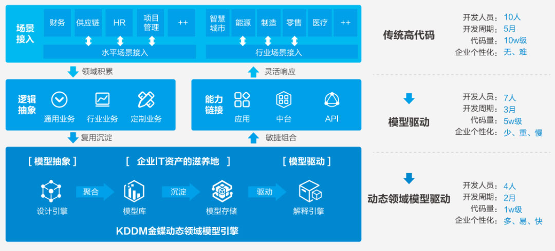 独创的动态领域模型(KDDM),更是金蝶技术能力的体现。KDDM是采用云原生、AI等先进技术研发的一套企业动态建模体系和方法论。但不同于传统低代码开发平台,KDDM已经大量预置了企业业务能力组件,可以快速构建应用,实现了敏捷迭代。