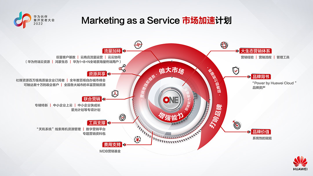 在《ONE—华为云和TA的朋友们2022》——华为伙伴暨开发者大会2022期间的一场特别节目上,华为云中国区副总裁、华为云中国区CMO张鹏宣布了面向伙伴的能力赋能计划——Marketing as a Service市场加速计划,赋能伙伴和开发者将创新带入畅销通道,全方位助力商业成功。