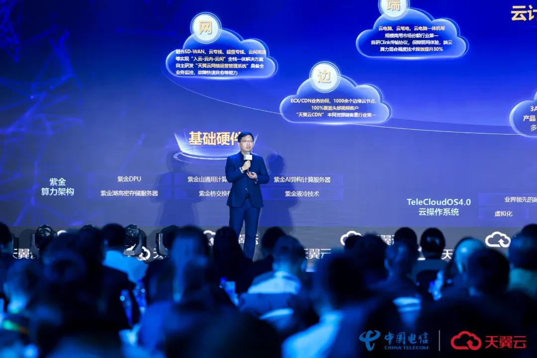 会上,天翼云科技有限公司云网产品事业部总经理杨鑫,围绕天翼云自主可控的国云底座以及面向AI+HPC构建的天翼云智算超算能力产品与技术展开分享。天翼云以自研云操作系统为核心,从底层基础软硬件技术,到上层高阶云能力,形成了技术领先、自主可控的“云网边端数智安”全栈云技术体系。通过基础设施、算力平台、算力调度和生态服务全面升级,为用户提供IaaS+PaaS+MaaS+SaaS 一体化服务,赋能千行百业数字化转型,服务数字经济高质量发展。