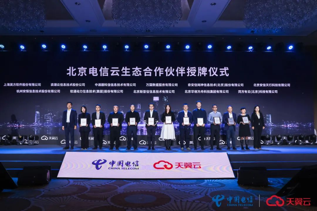 活动最后,中国电信北京公司为北京华创方舟、同方有云(北京)、上海英方软件等11家新招募云生态合作伙伴举行授牌仪式,中国电信北京公司副总经理孙健、天翼云科技有限公司助理总经理宫梅霞共同为合作伙伴代表授牌。