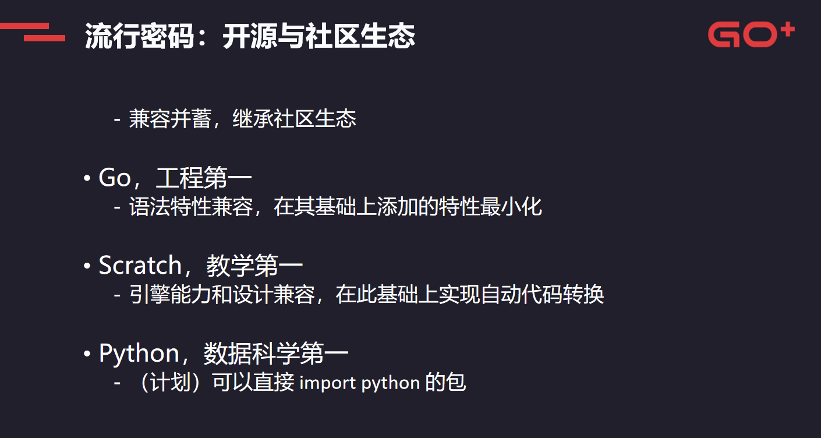 在Go语法特性的基础上,加最小的功能;在引擎能力和设计上兼容Scratch,并在此基础上实现自动化代码转换;在Python基础上直接import Python的包,去解决Go+在数据科学领域生态薄弱的问题。这也是许式伟眼中Go+的流行密码,兼容并蓄,继承多重社区生态。进而实现Go+的目标,站在巨人的肩膀上加速普及与应用。