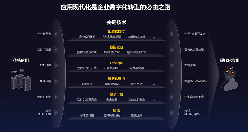 六大关键技术蕴含着三大创新:首先,通过低代码开发实现组装式交付,代表了应用交付方式的创新,让应用的使用者参与到应用的开发构建中来,从专业开发走向全民开发,从而能够加速业务创新和孵化;其次,从传统的“瀑布式”开发到云上数智驱动的DevOps,代表了研发模式的创新,实现应用开发的自动化和智能化,应用的TTM将缩短到周甚至天级;第三,通过微服务/serverless等架构演进,代表了云上新技术的创新,采用多活高可用的部署将提升企业业务的韧性,并实现应用从供应链、开发态到运行态的全栈全生命周期安全。