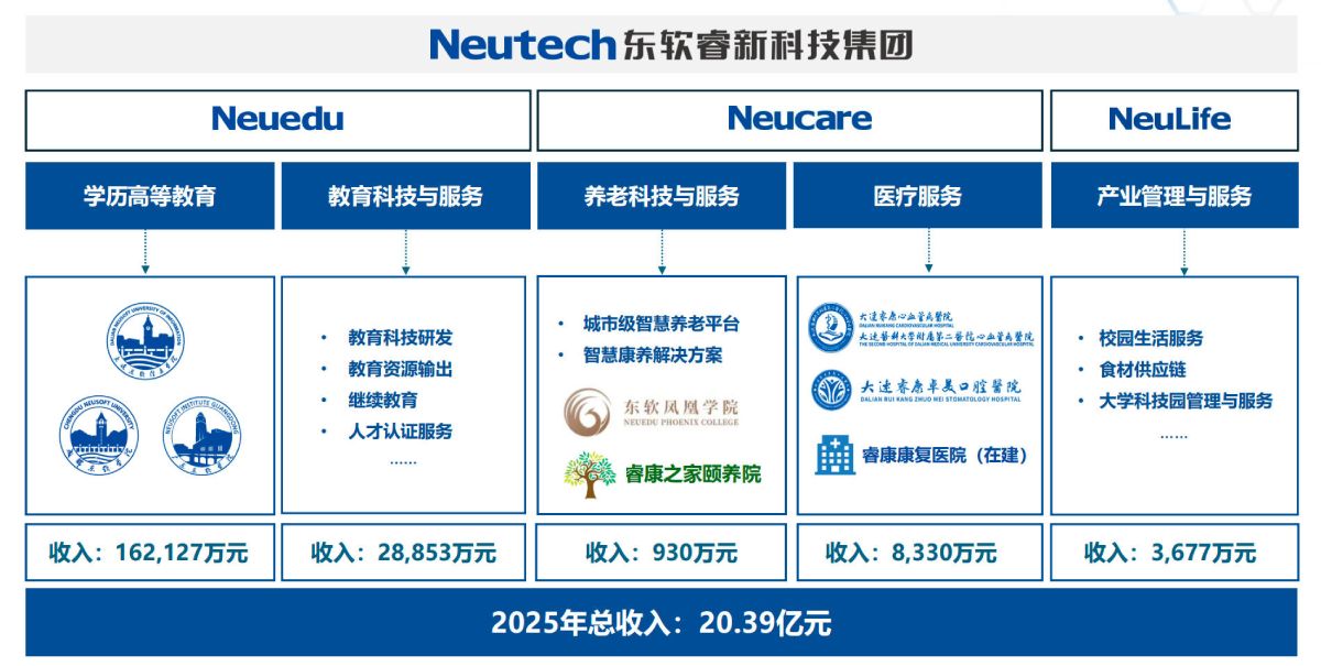 公司明确了“致力于成为教医养生态引领者”的愿景,现已构建起涵盖学历高等教育服务、教育科技与服务、养老科技与服务、医疗服务、产业管理与服务五大板块的多元化业务体系。这意味着,东软睿新已正式完成从“单一业务模型”向“多业务协同体系”的战略升级。