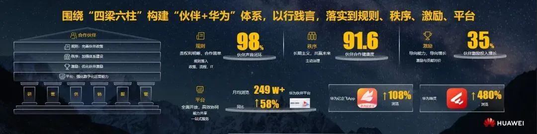 去年,华为伙伴平台的浏览量提升了58%,达到每月近250万次;其中,“亿企飞”浏览量提升108%,华为坤灵官网以及APP浏览量实现超480%的增长。