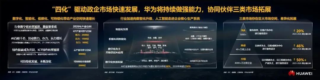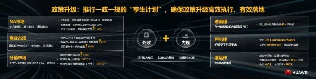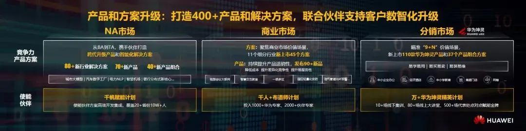 因此,我们要做全面的升级,一是产品和方案的升级。今年将进一步推出400+的产品和解决方案,联合伙伴支持客户的数智化升级;对于NA市场,我们有80个行业解决方案,70个新产品,40+的产品组合。对于商业市场,我们进行了行业细分,聚焦11个行业,新上市45个方案,发布90+的产品;对于分销市场,瞄准“9+N”的价值场景,将上市110款华为坤灵产品和37个小而美的产品组合。