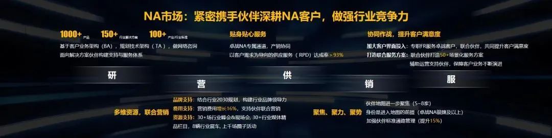 我们将进一步满足能力型伙伴诉求,其中伙伴地图进一步聚焦,由去年的12家变成5-8家;同时身份是进入地图的前提,卓战NA要求银牌及以上;并将加强伙伴标准通路管理,这个方面将提升15%。