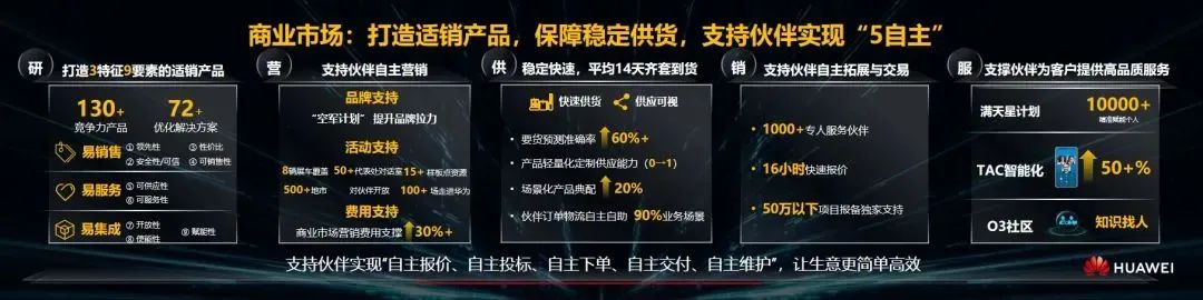 与NA市场不同,商业市场我们重点是通过研发打造适合于商业市场的适销产品,保障供货的稳定(平均控制在14天以内),更重要的是支持伙伴能够做到“5自主”,即自主报价、自主投标、自主下单、自主交付、自主维护,让伙伴做生意更容易、更简单。为此,在“研”方面,我们围绕伙伴诉求打造产品方案;在“营”方面,通过“空军计划”支持商业市场做好品牌拉力,并充分开放我们所有的营销资源,包括华为公司总部、15+个样板点,50+个代表处对话室,以及8辆展车等。