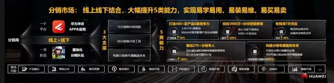 我们还将大幅提升研营供销服5类能力,包括提供超过400+款具备“6易”竞争力的产品,同时结合伙伴需求管理产品生命周期,上市110+款新品;同时通过线上+线下结合的方式,打造6000+沙龙活动。在供货方面,今年将实现现货供应率90%,7天到货,现货比例提升69%。在销服方面,我们将进一步加大队伍建设,新增270名分销专人为分销商服务,投入提升180%;并将通过在代表处设置分销服务经理,400专属分销坐席/APP智能客服,实现智能客服问题解决率超80%。