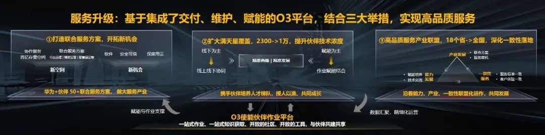 服务升级是以集成了交付、维护和赋能的O3平台为基础,结合三大举措,目标是要实现不管客户在哪里,他都能获得一致性的高品质的服务。