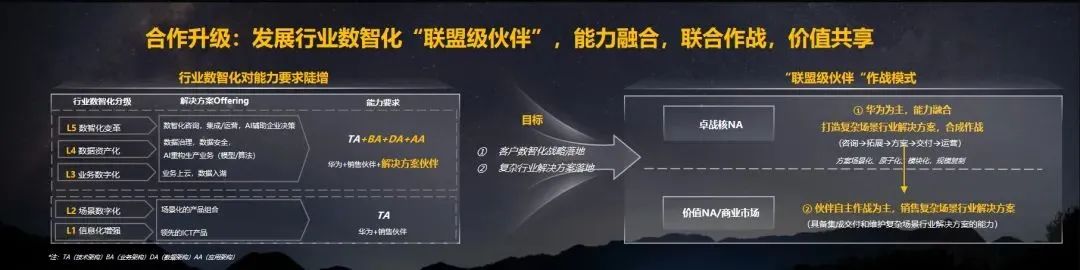 合作升级是我们今年的一个重大举措。面向数智化转型一共有五类:L1和L2是产品和产品组合,过去的销售通路和联盟模式可以解决和覆盖这个问题;但从L3到L5,面对业务数智化、数据资产化以及数智化变革时,方案和场景就非常复杂,甚至是端到端、从一个咨询开始的,我们的伙伴里很少有能力能独立进行方案构建和销售。因此,我们在今年围绕着卓(越NA)战(略NA),我们将以华为为主,能力融合,一起围绕着复杂场景打造行业解决方案,大家联合作战。我们要将打造出来的行业解决方案场景化,服务原子化、模块化,形成可被快速复制,也可以围绕着不同的客户快速进行模块组合的方式,使得它易学易卖,最终再交给我们懂行的行业领头人——伙伴自行进行销售。同时,销售复杂场景的行业解决方案,也会通过华为On-Demand进行支持。目前,伙伴联盟正在构思中,也欢迎每一个细分行业的头部玩家一起积极参与。