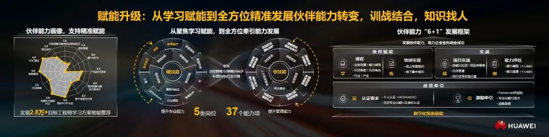 我们还构建了合作伙伴能力“6+1”发展框架,从聚焦学习赋能到全方位牵引能力发展。面向合作伙伴售前、售后、销售、商务、营销、管理者六类关键角色,通过“学、练、战、测、认、引”相结合,打造数字化装备平台,持续提升伙伴关键角色软硬技能,构建合理人才梯队,实现华为与伙伴共同成长,助力伙伴、华为商业成功。