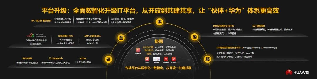 平台升级,前面已经介绍了一部分华为的平台,从研发、营销、供应、销售、服务,都有着自己的平台。今年我们会全面向伙伴开放,包括知识平台3朵云,包括报价的配置器SCT。SCT在今年将应用人工智能技术,使得配置极其简单;我们也可以通过人工智能的方式精确找到伙伴需要的产品技术具体品类,精确地把知识自动推送到伙伴员工的邮箱或者APP里去。最终,我们要实现作战平台从数字化走向数智化,从开放华为的能力和知识变成我们跟伙伴一起共建共享,并在平台中快速迭代。这才能让“伙伴+华为”的体系更加高效。