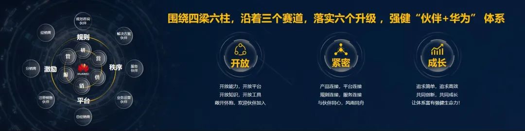 因此,我们围绕着“四梁六柱”沿着三个赛道,落实六个升级,这就是我们今年要做的事情。围绕的“四梁六柱”,就是紧扣伙伴体系建设的底座和核心,即规则、秩序、激励和平台,沿着NA、商业、分销三类市场三个赛道,落实六个升级,核心就是为了构建一个富有生命力的、强健的“伙伴+华为”体系,这个体系将具备三大特征:开放、紧密、成长。我们开放能力、平台、工具及知识;与伙伴共建平台,共建社区,共建工具,形成产品平台规则和服务的紧密连接,与伙伴同心,风雨同舟;同时追求简单,进一步地追求高效,用人工智能加持,共同创新,共同成长,让体系具备生命力。让我们的伙伴和华为形成一个有机的强大的生命体,最终让客户实现“数智世界,一触即达”。
