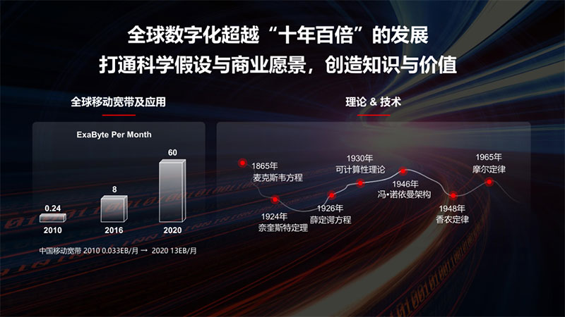 例如全球的移动宽带数据流量,从2010年的每月0.24艾字节,增长到2020年的每月60艾字节,在10年时间中增长超过250倍。