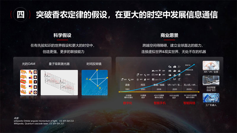 第四是在有别于香农定律的假设、以及更大的时空中探索信息通信,从而跨越空间的障碍,建设全球直达的能力,连接虚拟与现实世界、以及无处不在的机器。