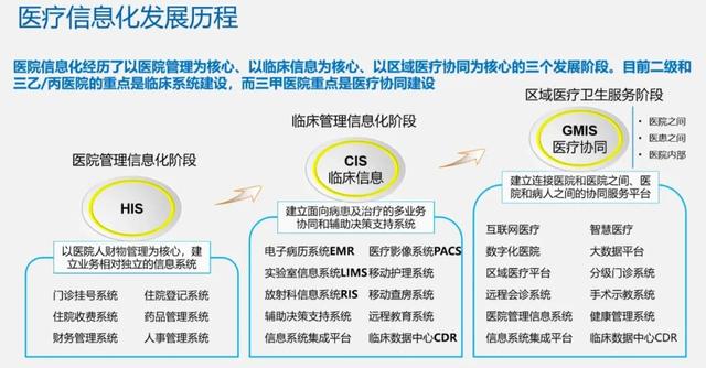 第三阶段就是国家在大力推广的区域医疗协同,以医联体+医共体为手段,推动医院之间进行数据共享、分级导诊等工作,实现医疗资源的充分利用,构建高效医疗服务系统,为病人提供全方位、连续性的医疗服务。