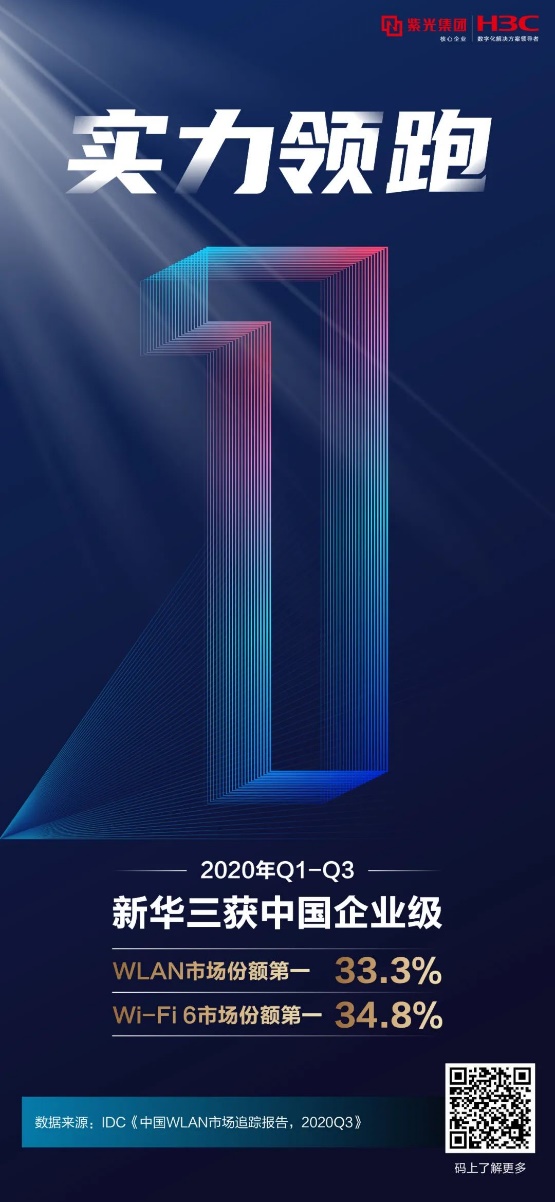 近日,IDC最新发布的《中国WLAN市场跟踪报告,2020Q3》显示,新华三集团以33.3%的市场份额稳居2020年前三季度中国企业级WLAN市场第一。这是继2009年以来,新华三连续十一年领跑中国企业级WLAN市场,背后展现出的是其深厚的技术积淀与领先实力。在代表最新无线局域网技术的Wi-Fi 6领域,新华三更是实力霸榜。报告显示,新华三Wi-Fi 6市场份额高达34.8%,占据市场的三分之一以上。