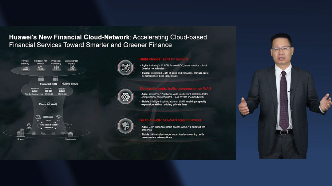 在数据中心、在广域网、在园区网络,不仅为数字金融架设一条网络联接高速路,华为同时利用L3.5自动驾驶网络、1-3-5智能运维、跨云编排、广域数据压缩等新技术助力打造金融云网的稳态可靠和敏态创新。