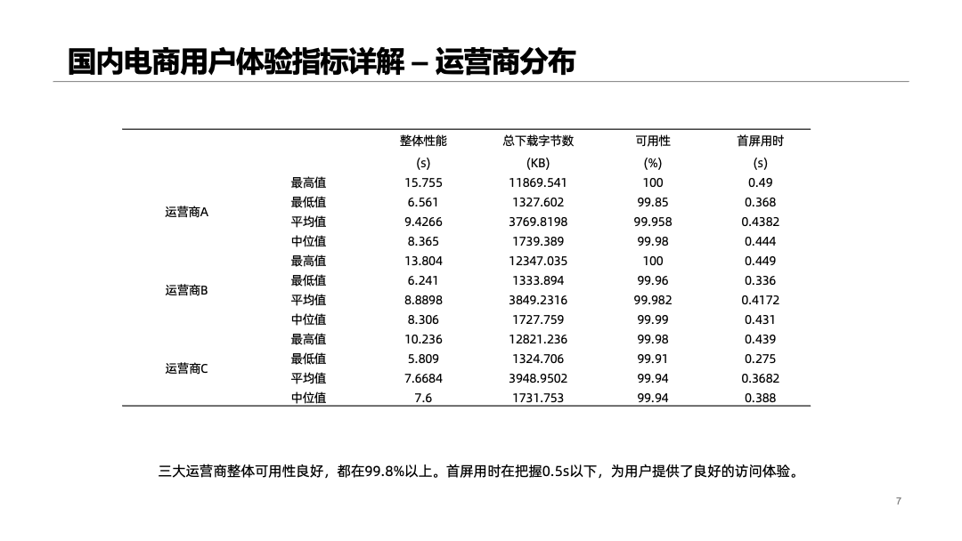 三大运营商整体可用性良好,都在99.8%以上。首屏用时在把握0.5s以下,为用户提供了良好的访问体验。