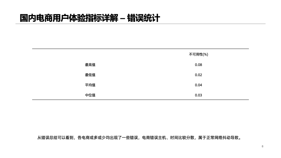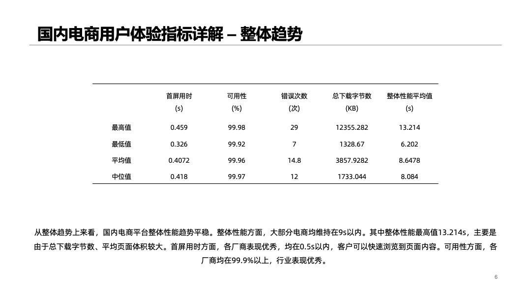从整体趋势上来看,国内电商平台整体性能趋势平稳。整体性能方面,大部分电商均维持在9s以内。其中整体性能最高值13.214s,主要是 由于总下载字节数、平均页面体积较大。首屏用时方面,各厂商表现优秀,均在0.5s以内,客户可以快速浏览到页面内容。可用性方面,各 厂商均在99.9%以上,行业表现优秀。