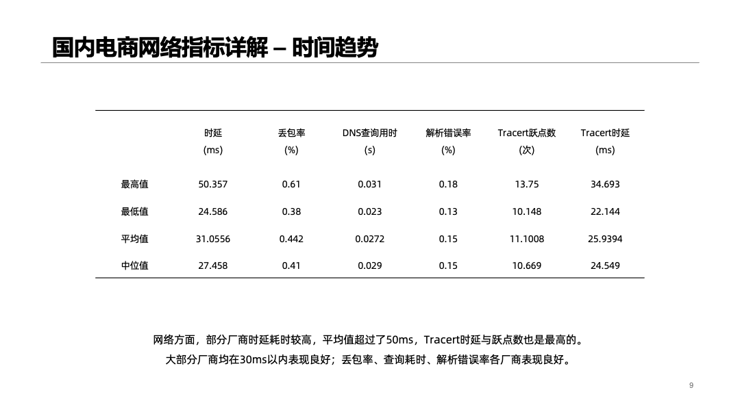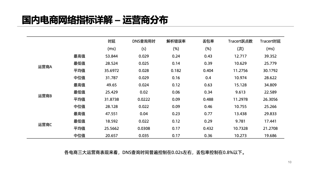 各电商三大运营商表现来看,DNS查询时间普遍控制在0.02s左右,丢包率控制在0.8%以下。