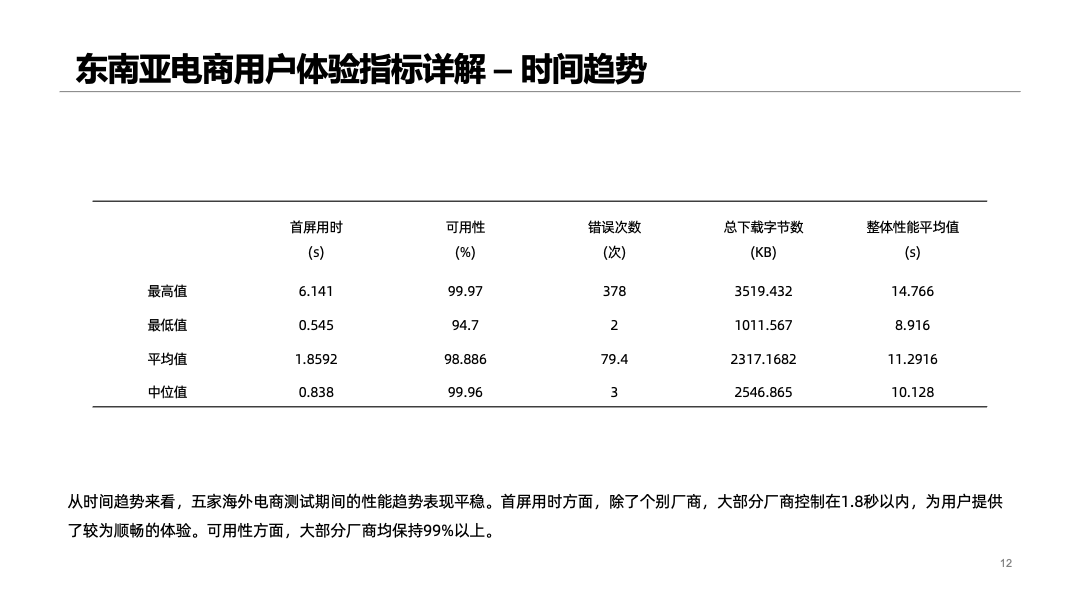 从时间趋势来看,五家海外电商测试期间的性能趋势表现平稳。首屏用时方面,除了个别厂商,大部分厂商控制在1.8秒以内,为用户提供了较为顺畅的体验。可用性方面,大部分厂商均保持99%以上。