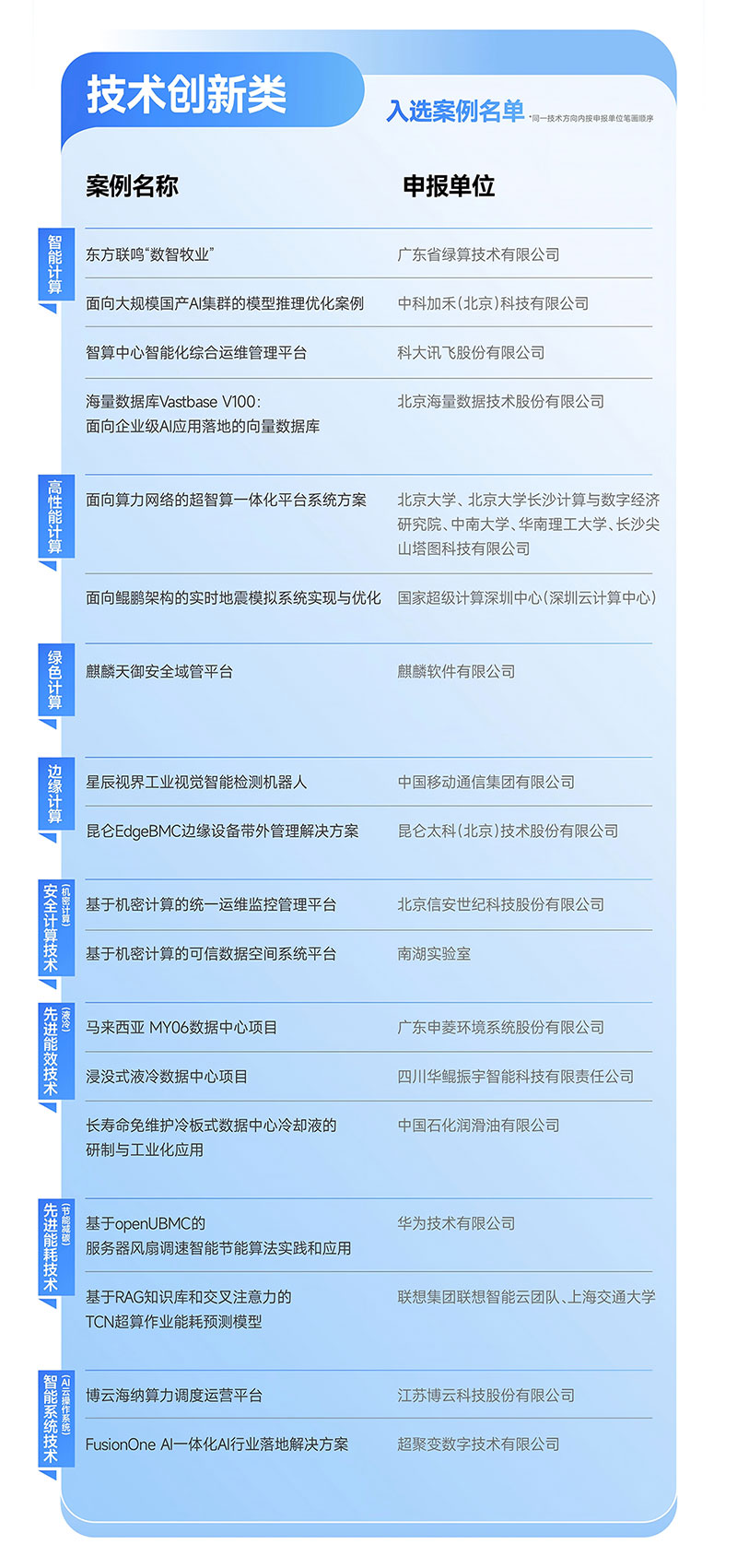 为保障评选专业性,GCC组建由技术指导委员会(TC)、分支机构专家、行业领军学者、权威媒体代表及资深分析师构成的编委会,历经多轮材料审核、技术论证与综合评审,最终筛选出年度技术创新与行业应用两大方向的标杆案例,同时首次推评 “编委会特别推荐” 称号,树立具有突破性价值的实践成果标杆。