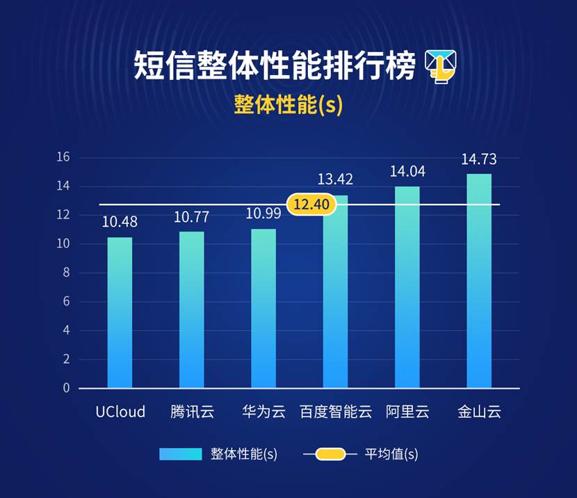 在2021年8月短信整体性能排行榜中,整体性能均值12.937s,其中UCloud、腾讯云、华为云位列前三。值得一提的是,UCloud虽然在到达率排行榜上表现不佳,但其整体性能却表现出色,在三千多份样本数据中,其整体性能均值能达到10.482s。