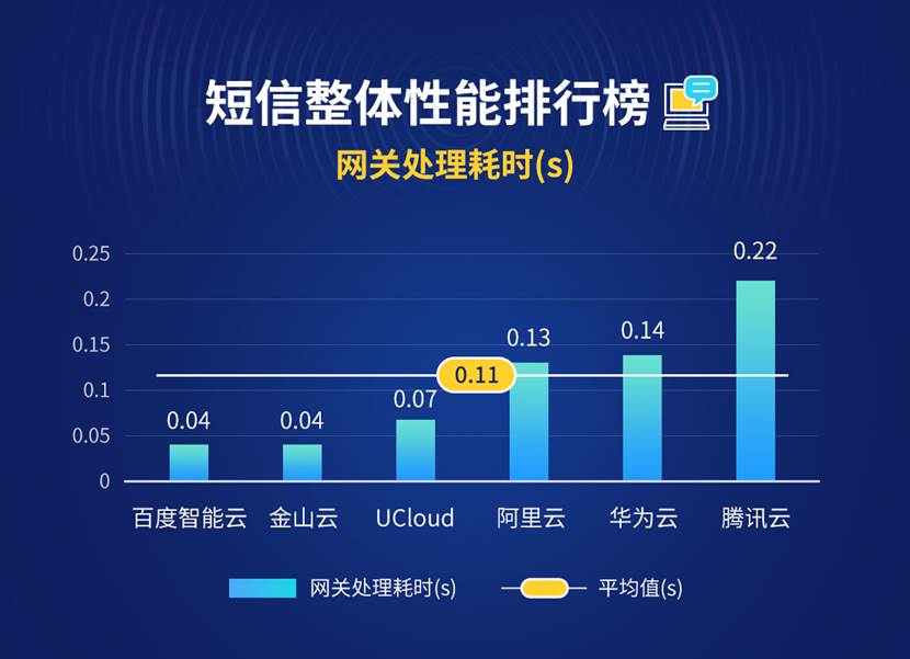 在2021年8月短信网关处理耗时排行榜中,网关处理耗时均值为0.109s,其中百度智能云、金山云、UCloud位列前三,并且百度智能云、金山云的网关处理耗时均在0.05s之内,短信服务响应十分迅速。