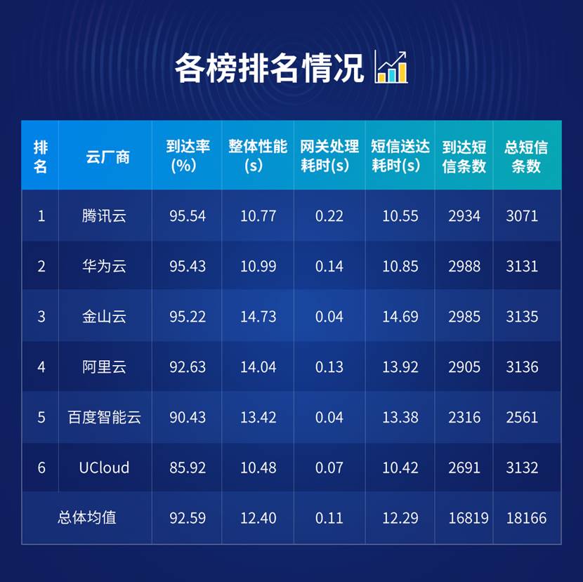 在2021年8月短信到达率排行榜中,总体到达率平均值为92.59%,其中腾讯云、华为云、金山云位列前三。