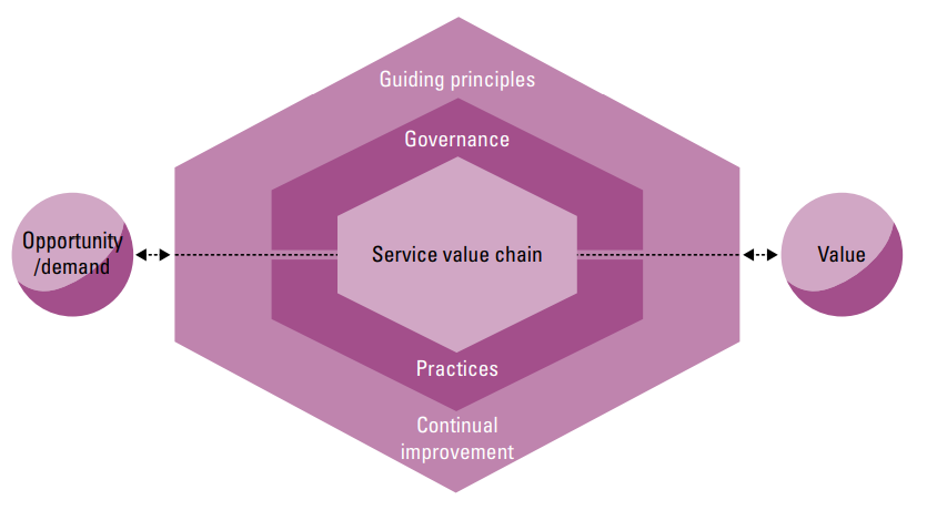 特别是ITIL 4的发布,对原有的理念、模型、方法和流程进行了非常大的革新,和ITIL V2讲流程管理、ITIL V3强调IT服务不同,ITIL 4注重服务价值的创造,新版本推出的SVS(服务价值体系)、SVC(服务价值链)全新框架可以看出这一点。ITIL 4重构了IT服务价值表述方式,其提出:在数字化时代,每个组织都是一个服务组织,而如今几乎所有服务都由IT驱动的,所以服务管理被作为一组特定的组织能力,最终以服务的形式为客户创造价值。