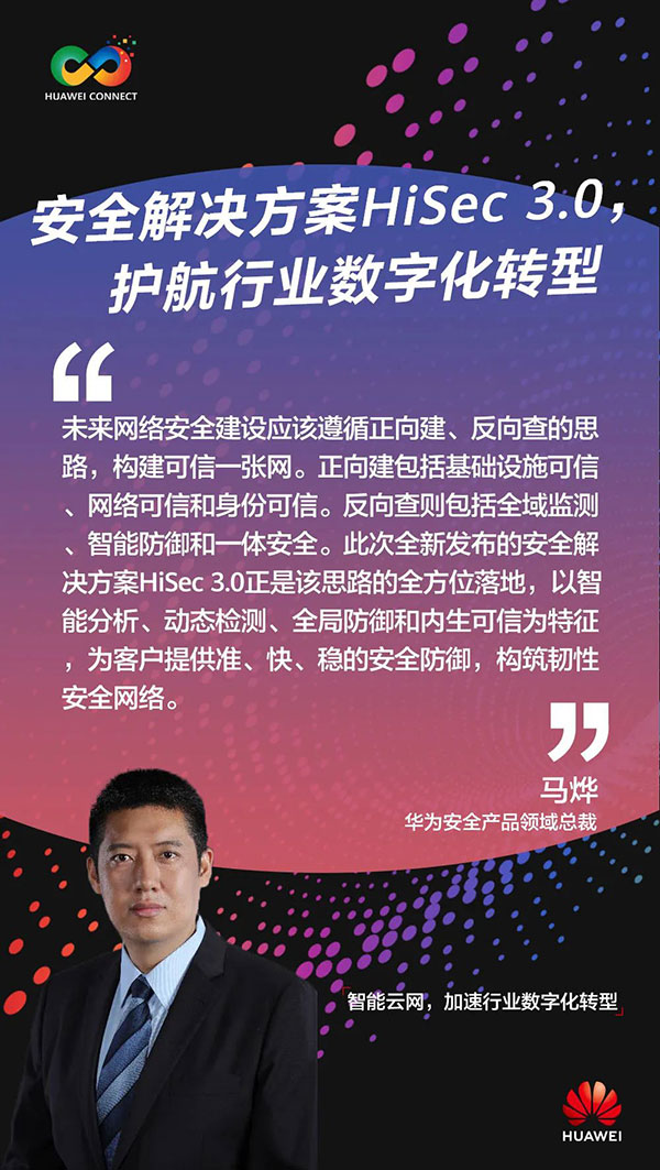 华为安全产品领域总裁马烨表示:“未来网络安全建设应该遵循正向建、反向查的思路,构建可信一张网。此次全新发布的安全解决方案HiSec 3.0正是该思路的全方位落地,以智能分析、动态检测、全局防御和内生可信为特征,为客户提供准、快、稳的安全防御,构筑韧性安全网络”。
