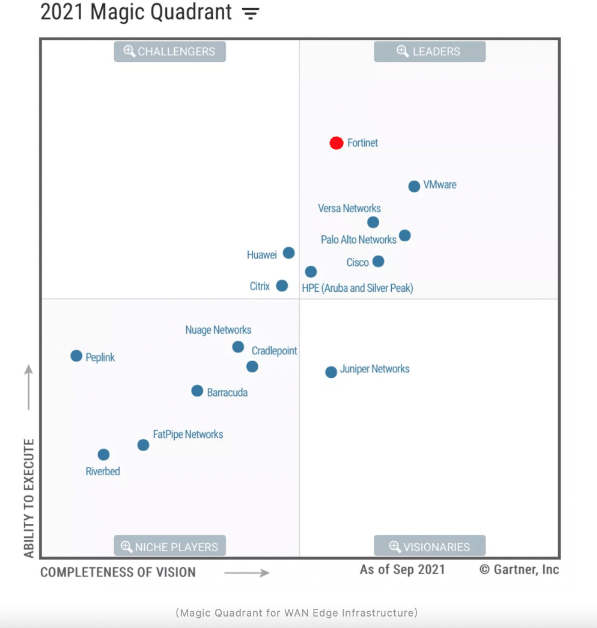 不久前,Gartner发布2021广域网边缘基础设施魔力象限报告,Fortinet再次进入领导者象限,并在整个魔力象限中位居最高执行力。“在防火墙中SD-WAN做得最好,在SD-WAN中防火墙做得最好”,这即是Fortinet的独特之处。在安全成为SD-WAN内生能力的今天,Fortinet将二者合一打造的FortiGate成为吸引客户的最大亮点。