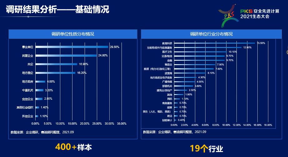 本次调研共收集到400多份有效问卷,样本量涵盖到政府、金融、电信、互联网、医疗、教育科研、制造等19个行业。从行业分布来看,本次调研行业参与度较为广泛,教育科研、互联网/软件与信息服务、医疗卫生行业参与度较高,分别达到15.5%、12.9%、10.1%;从单位性质分布来看,与2019年有所不同的是,本次调研事业单位占比最多,达29.5%,其次为民营企业,占24.8%。此外,央企、地方国企的参与度也较高。
