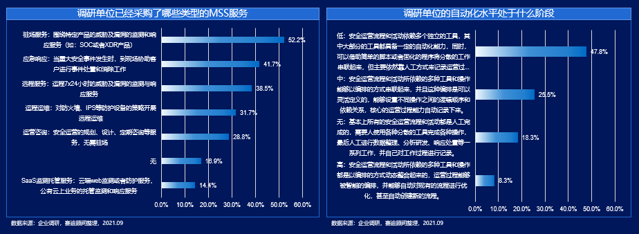 从安全运营中心的运营成本及安全能力考虑,现阶段市场中也衍生出了托管安全服务(MSS服务)的新方式。企业采购最多的MSS服务是围绕特定产品威胁及漏洞进行监测响应的驻场服务,占比达52.2%。