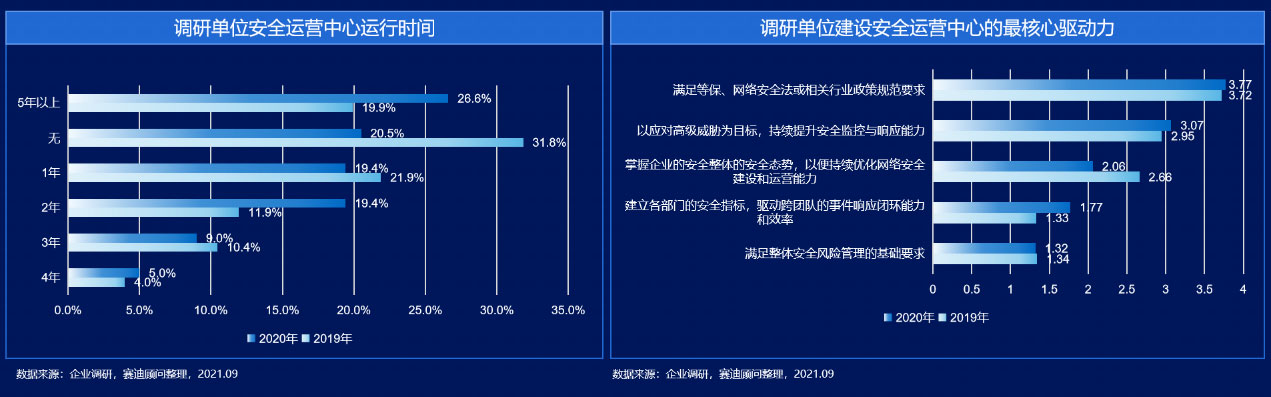 从《报告》数据来看,已有79.5%的企业已经建立了专门的安全运营中心。并且以最近两年新建的居多,占38.8%,此外,建立5年以上的也达26.6%,以央企、事业单位为主,重点分布在金融、互联网、能源等对安全运营重视程度较高的行业。与2019的调研结果对比,可以看出“无”的占比在大幅下降,说明越来越多的企业意识到安全运营的重要性,纷纷开始布局。