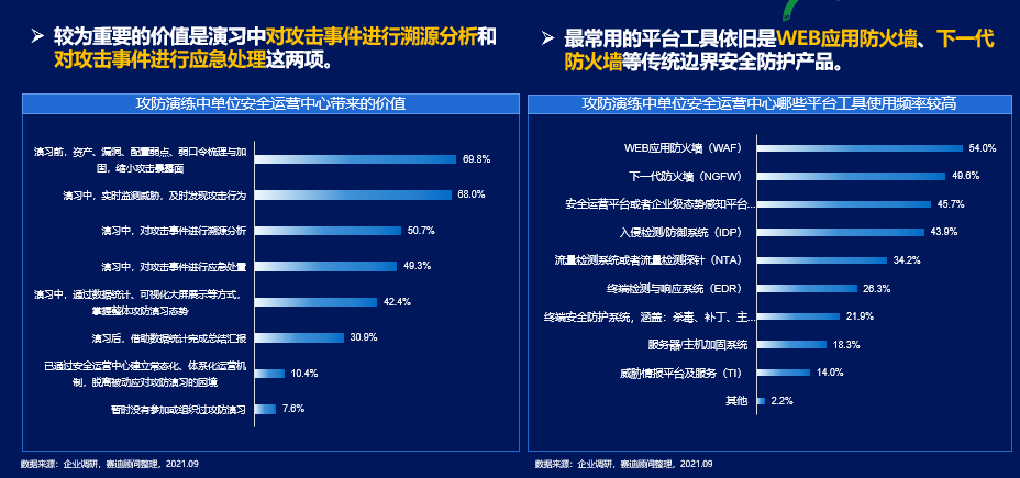 《报告》分析认为,安全运营中心在攻防演练中较为重要的价值是,演习中对攻击事件进行溯源分析和对攻击事件进行应急处理这两项,占比分别为50.7%和49.3%。