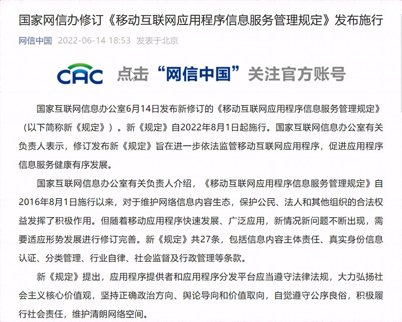 6月14日,国家互联网信息办公室对外发布了新修订的《移动互联网应用程序信息服务管理规定》(以下简称新《规定》)。新《规定》对数据安全和个人信息保护、未成年人保护等管理制度进行了进一步明确和细化,并要求应用程序提供者和应用程序分发平台应当履行信息内容管理主体责任,确保网络安全,维护良好网络生态。新《规定》将自2022年8月1日起施行。
