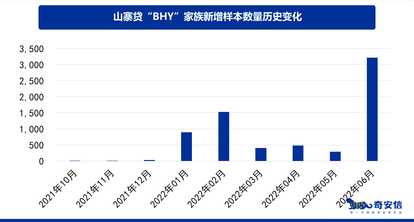 2022年6月,奇安信病毒响应中心移动安全团队监测到伪山寨贷木马“BHY”,又开始进入新一轮的爆发期。“BHY”最早出现于2021年10月,常伪装成为国内部分知名商业银行信贷应用,在最近的不到半个月时间,该团伙就投递使用了三千多个样本。