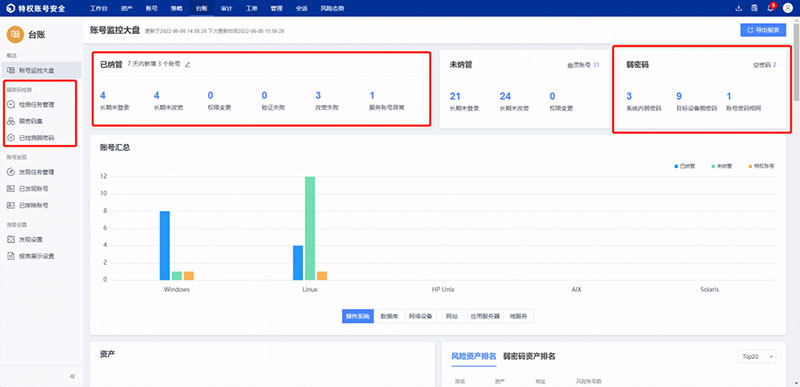 同时,因涉及到攻击者的最终利益,特权账号往往是攻击者瞄准的重点攻击目标。特权账号由于其分布广、数量多的特点造成特权账号梳理难,组织管理员无法全面的掌握特权账号动态情况。加上僵尸账号、幽灵账号、后门账号、弱口令账号、长期未改密账号等风险账号等广泛存在,且比较隐蔽,给系统资产带来很大的安全隐患。