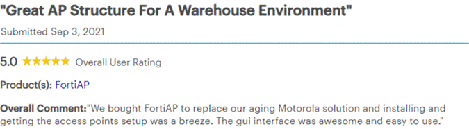 适用于仓库环境的绝佳 AP 架构——“我们购买了 FortiAP,接入点的安装和设置非常轻松便捷。GUI界面非常简单直观、易于操作。”