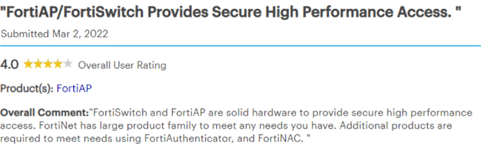 FortiAP/FortiSwitch 支持高性能安全访问——“FortiSwitch和FortiAP两款硬件性能可靠,支持高性能安全访问。而Fortinet丰富多样的产品系列,可满足用户的任何需求。此外,还可搭配部署FortiAuthenticator和FortiNAC,满足更多安全需求。”