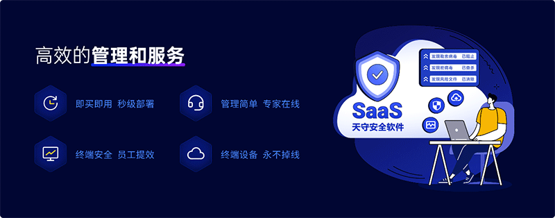 天守仅需要互联网就可以快速部署到终端设备上,真正做到了部署零成本,即便没有任何安全管理知识的用户,也可以通过天守提供的企业管理平台快速对可疑行为、病毒和各类攻击进行全方位保护。同时,天守把服务器部署在云端进行管理,节省了服务器的购买和运维成本。