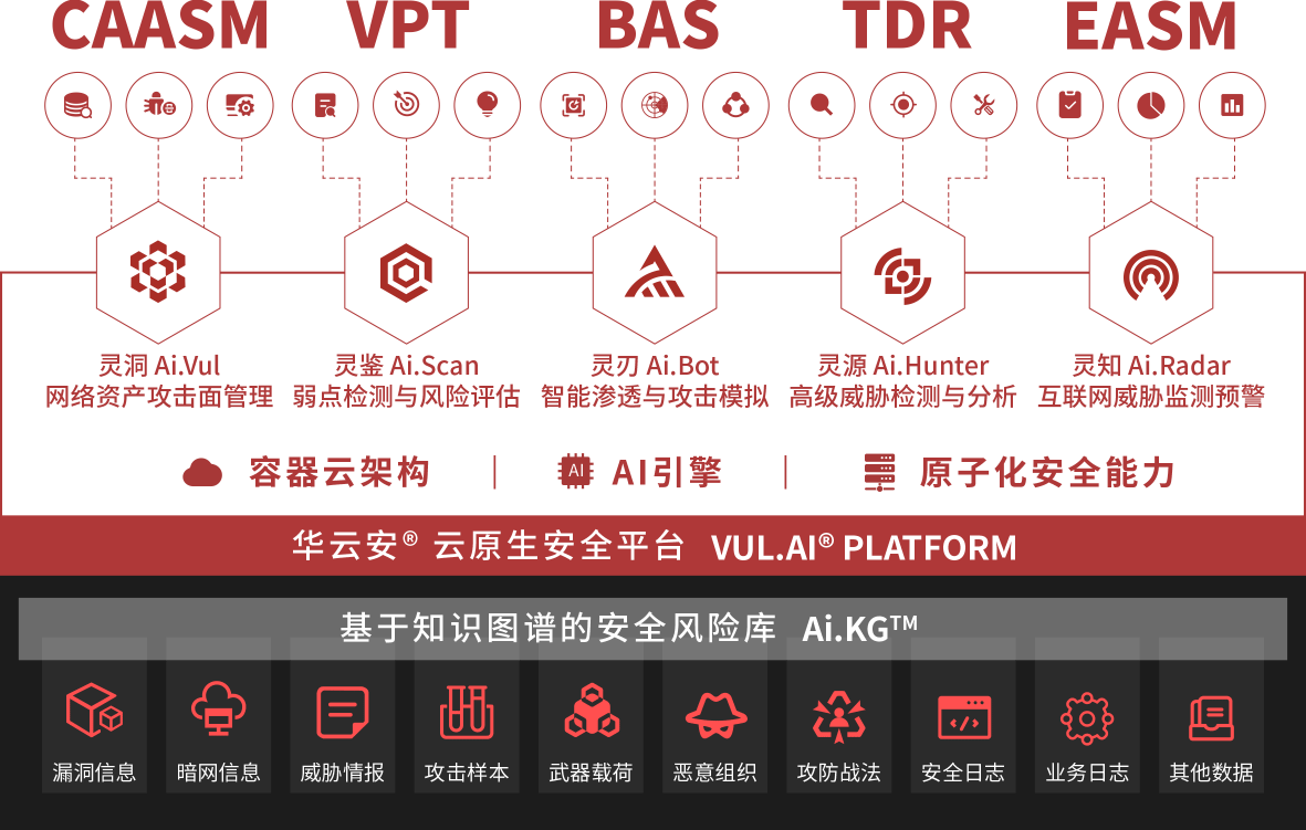 其次,为了将这一套完整的安全验证方法论落到实处,华云安基于攻击者视角构建了完整的安全验证产品与服务体系,包括定位于内部资产攻击面管理的灵洞·网络资产攻击面管理(Ai.Vul),定位于外部资产攻击面管理的灵知·互联网监测预警中心(Ai.Radar),定位于入侵和攻击模拟的灵刃·智能渗透与攻击模拟(Ai.Bot),以及渗透测试即服务、红队服务。