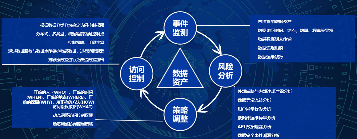 对此,奇安天盾数据安全保护系统能够基于六全框架,即全链路监测、全穿透识别,全兵种协同、全闭环处置以及全天候控制、全场景防护,将“事件监测、风险分析、策略调整、访问控制”融为一套完整闭环体系,解决各种主要的数据安全问题,做到“能看清、能管好、能防住”。