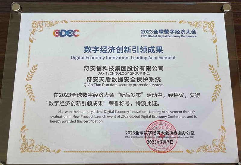 7月7日,2023全球数字经济大会正式发布了数字经济新品成果征集评选结果。奇安信自主研发的“奇安天盾数据安全保护系统”(简称:奇安天盾)凭借“能看清、能管好、能防住”的一体化保护能力脱颖而出,荣获“创新引领成果”奖。